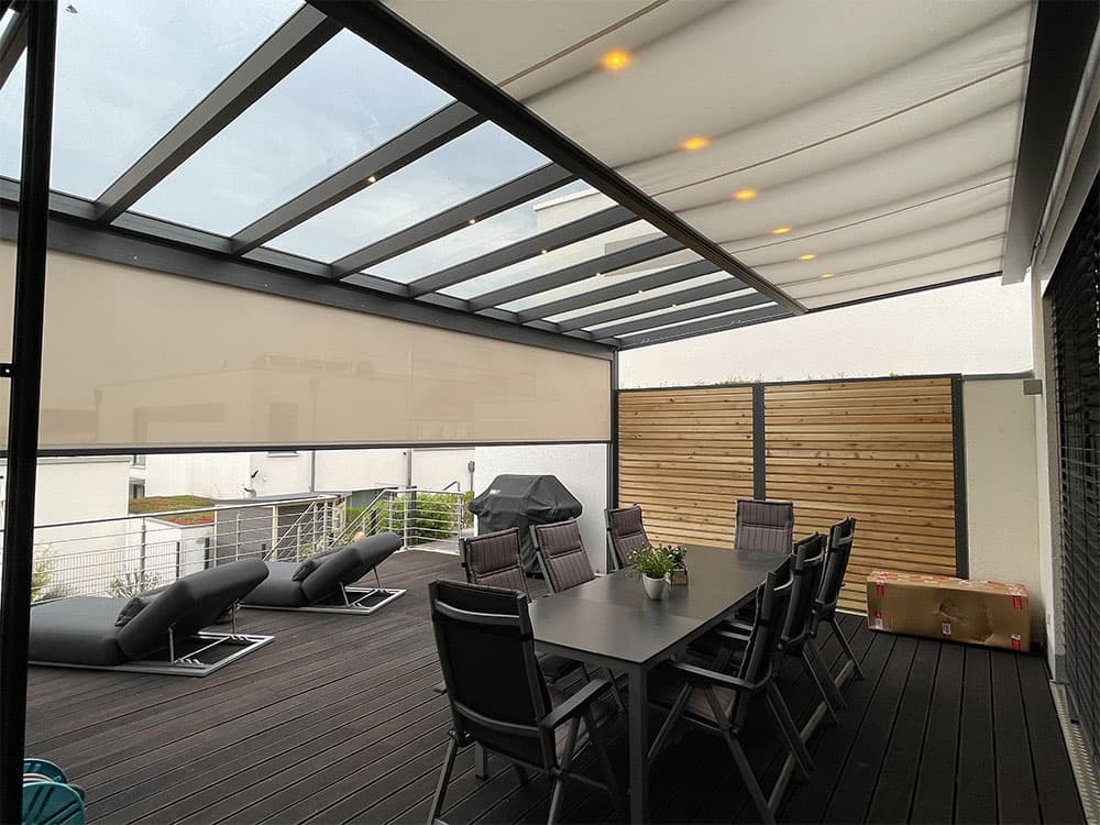 Je nach ihren Bedürfnissen können Sie den perfekten Stoff für ihre Bedürfnisse auswählen. Je nach Stoff und Farbe erreichen Sie eine hohe Reflexion des Lichtes oder hohen Lichteintrag ohne hierbei geblendet zu werden. Die Stoffe sind witterungsbeständig und schmutzabweisend und dabei wetter- und lichtecht.